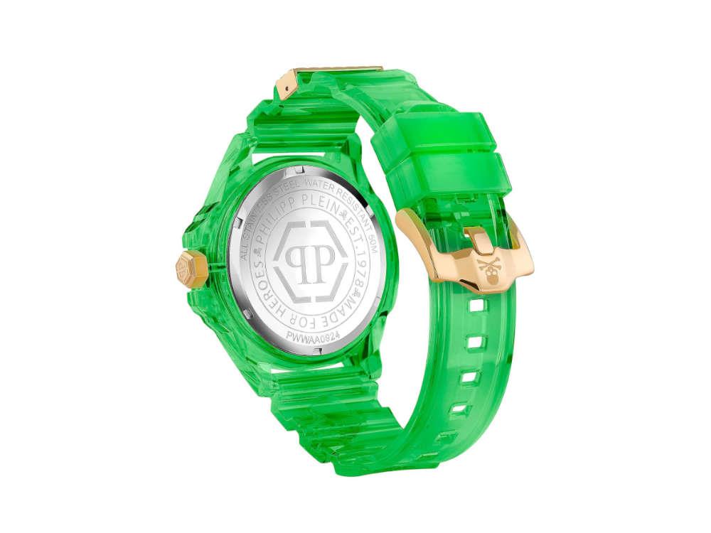 • Philipp Plein präsentiert neue Farben in seiner $kull Scuba Duba Kollektion. Die Uhr behält ihr einzigartiges DNA und modernes Design bei, mit einem goldenen Schädel auf dem Zifferblatt und einem Stahlgehäuse, das mit grünem PVD beschichtet ist, mit passendem Polycarbonatarmband. Sie hat einen Durchmesser von 44 mm, goldene Details und eine Wasserdichtigkeit von 5ATM.